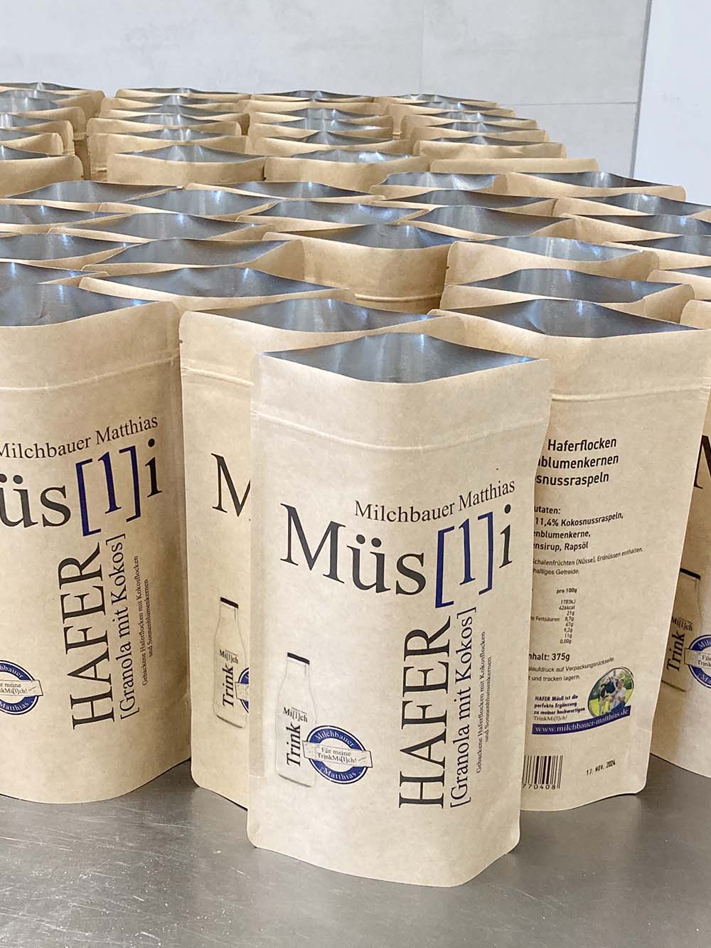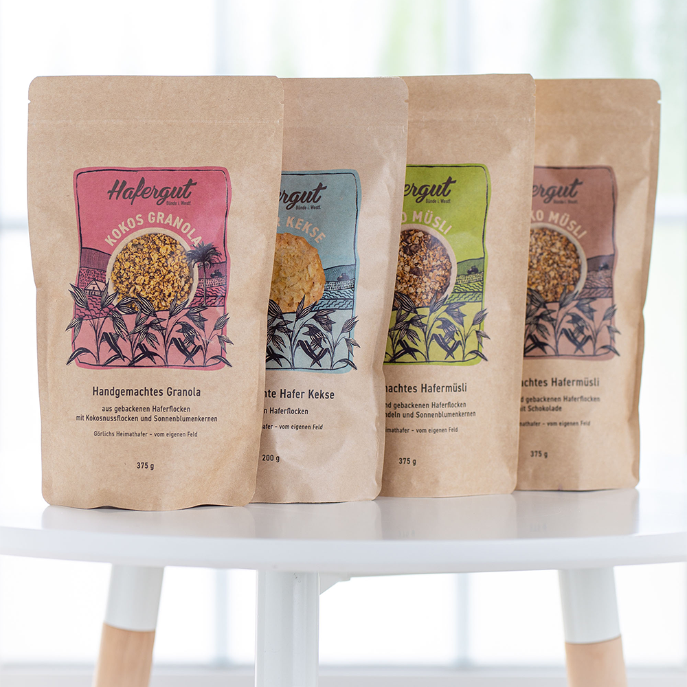 Für Haferflocken, Hafermehl und Haferkerne verwenden wir Papiertüten mit Reiter (Links im Bild). Gerne nutzen wir diese auch für unser Müsli- und Granola, um euch größere Verpackungseinheiten wie 1 kg oder 2 kg anbieten zu können.