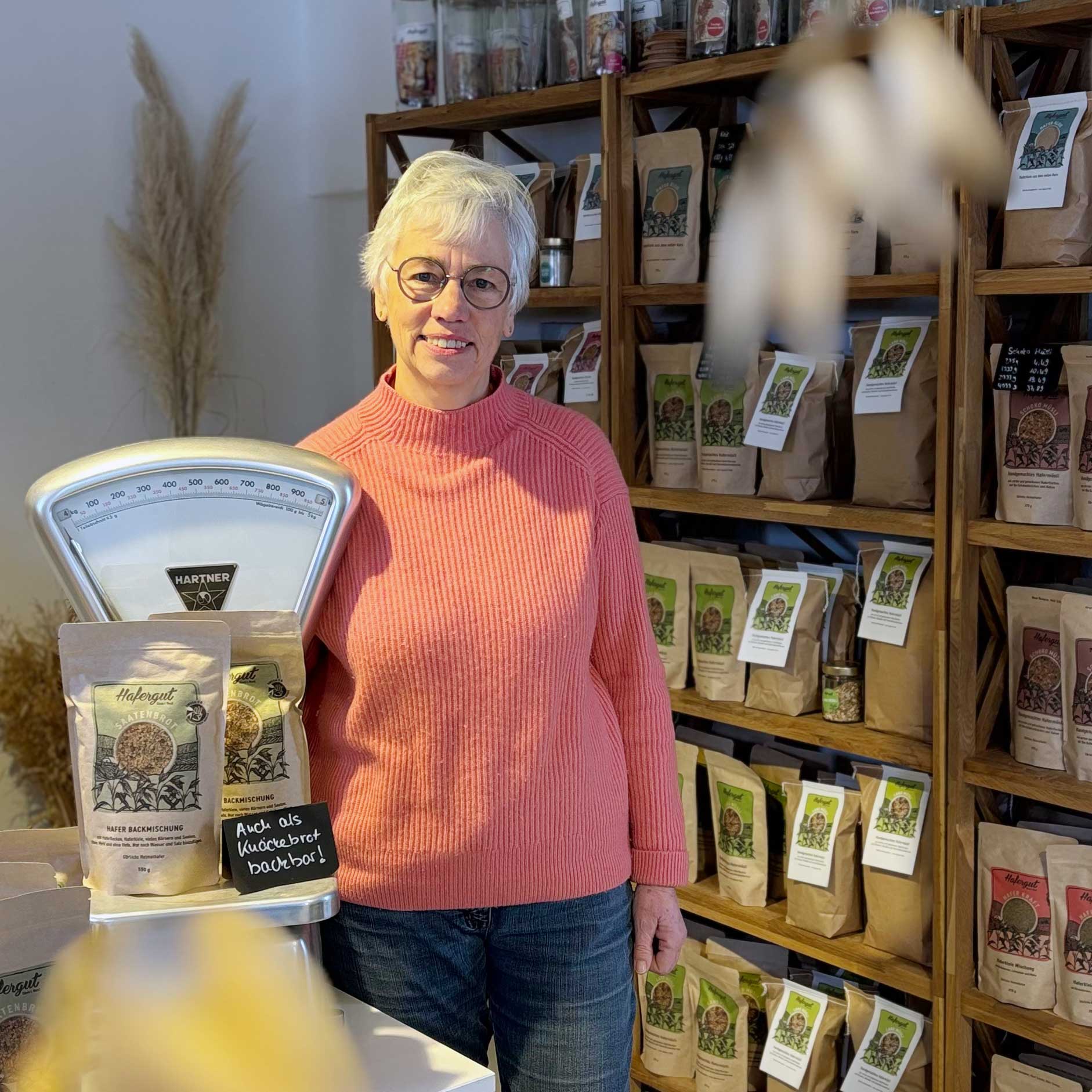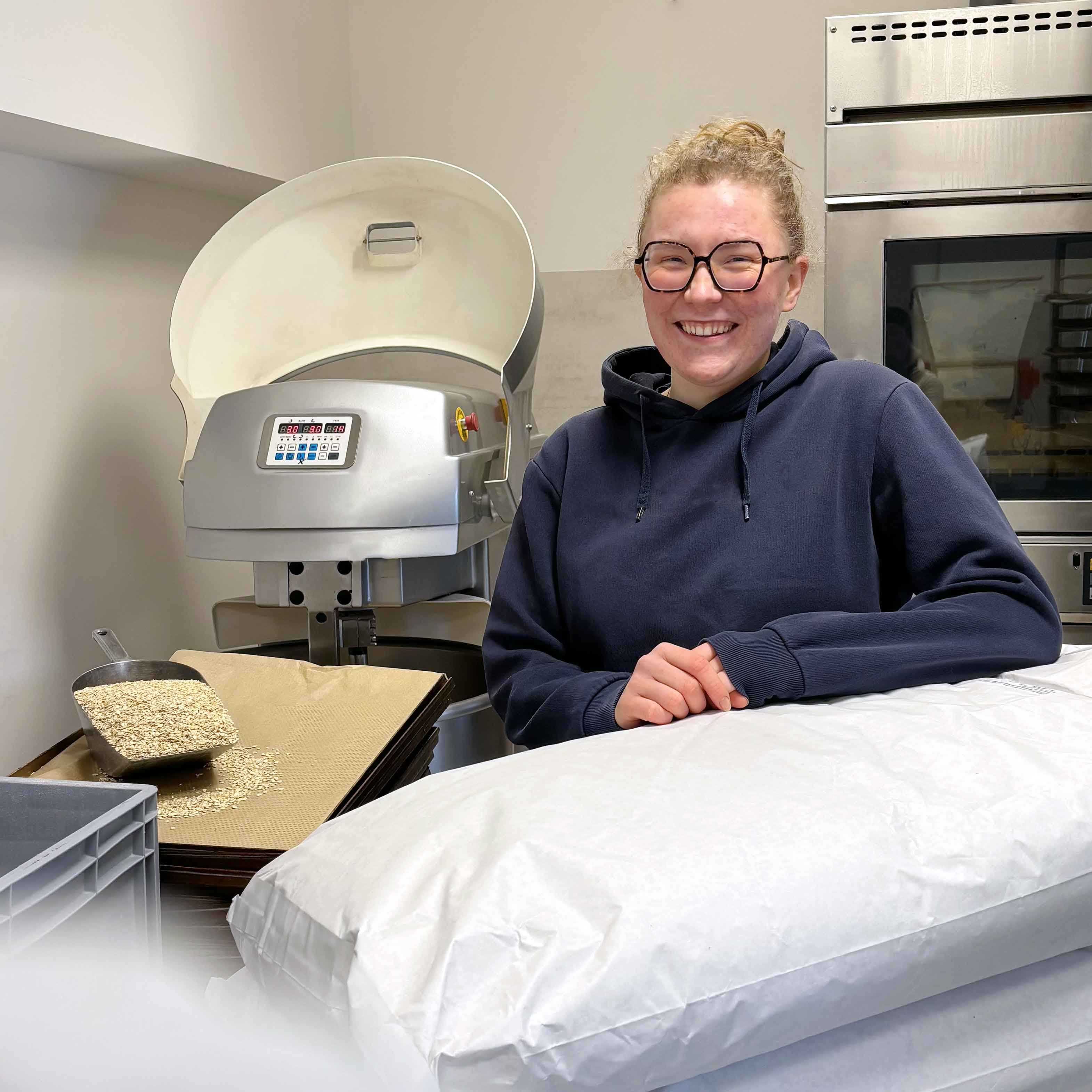 Sie unterstützt das Team nicht nur beim Abpacken, oder Backen, sondern stellt sicher, dass alles makellos und blitzeblank ist. Sie ist die schnellste im Tüten öffnen und ihr Perfektionismus ist wirklich bewundernswert. Ihrem scharfen Blick entgeht kein Detail! Ihre tatkräftige Unterstützung sorgt stets für ein reich gefülltes Lager, mit köstlichen Produkten vom Hafergut.